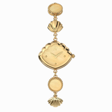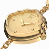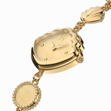 The clam shell–shaped case flows seamlessly into bracelet links inspired by coins made from mother of pearl stones, each framed in a delicate milgrain pattern and connected by tiny clam links to form a graceful bracelet. Finished in 18K gold plating and protected by sapphire crystal glass, every detail is designed to feel both precious and effortless.