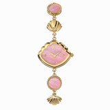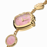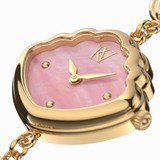 The clam shell–shaped case flows into bracelet links inspired by coins made from mother of pearl stones, each framed in a fine milgrain pattern and connected by tiny clam links to create a graceful, jewellery-like silhouette. Finished in 18K gold plating and protected by sapphire crystal glass, every detail is designed to feel timeless and feminine.